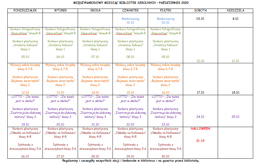 Kochani uczniowie! Październik to Miesiąc Bibliotek Szkolnych, czyli nasze święto! A jak przystało na święto nie może się obyć bez atrakcji 🙂 wypatrujcie konkursów i atrakcji już od tego tygodnia! Poniżej rozpiska części z naszych planów na najbliższe dni. Liczymy na Wasze zaangażowanie 🙂
