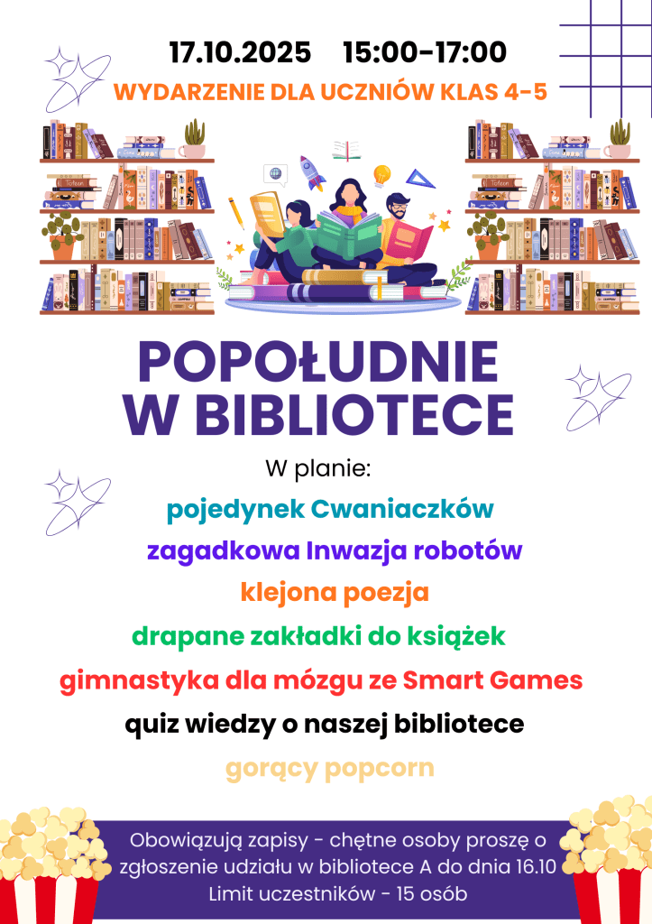 Z okazji Nocy bibliotek nasza biblioteka w budynku A organizuje gry i zabawy dla uczniów klas 4-5. Otrzymaliśmy już plakaty, zakładki i inne prezenty od organizatora krajowych obchodów Nocy bibliotek. Serdecznie zapraszamy do zapisów.